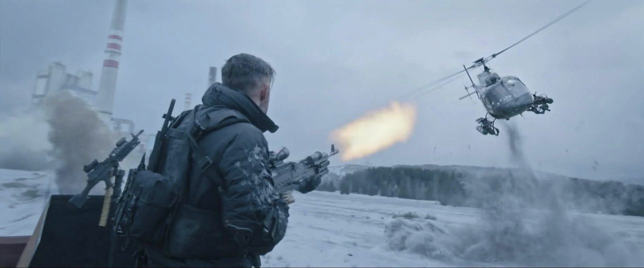 Nik rushes toward the engine car as Tyler heads outside. In a proper David versus Goliath moment, the helicopter fires on the train as Tyler fires on the copter. As the copter evades fire, Tyler steps inside one of the cargo containers where a cache of weapons is located. He flips back a container to reveal a massive belt-fed machine gun that’s practically the size of Tyler himself. He straps it on and kicks open the container doors where the copter greets him with a fresh round of fire. But Tyler responds in kind as he unleashes the machine gun on the helicopter, landing direct fire on the vehicle’s windshield. The helicopter crashes and explodes into the ground just as another helicopter sweeps into view.